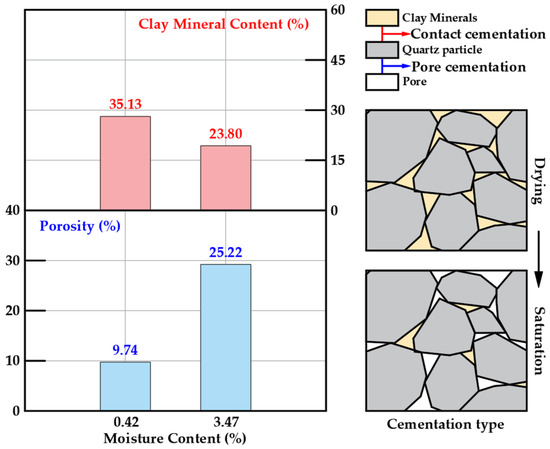 The microscopic tests indicated that water infiltration significantly influences the microstructural evolution of weakly cemented mudstone. Specifically, water infiltration primarily induces micropore development and dissolution of cementitious materials, changing the cementation type from original contact-based cementation (between quartz particles and clay minerals) to predominantly pore-based cementation between aggregates, with only limited contact cementation remaining, as shown in Figure 9. The shift in cementation type significantly affects the microstructure of weakly cemented mudstone, greatly weakening the cementing strength responsible for structural stability and reducing constraints on pore expansion and micro-fissure growth. Consequently, the mudstone’s mechanical strength and deformation resistance deteriorate noticeably. In the mechanical tests described in Section 2, samples with higher moisture content exhibit a pronounced decrease in bearing capacity and a marked increase in damage.