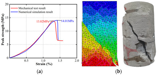 Comparison of numerical modeling results with physical and mechanical testing: (a) stress–strain curves; (b) deformation and failure characteristics.