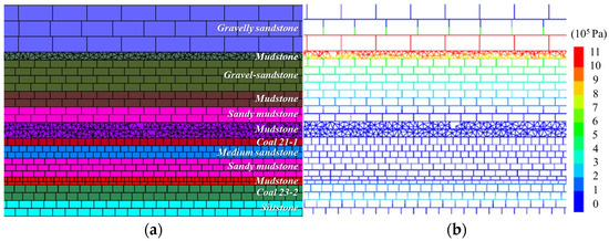 Based on these parameters, a two-dimensional mining model with a length of 500 m, width of 135 m, and depth of 350 m was developed. Coal pillars, each 150 m wide, were placed on both sides of the working face to eliminate boundary effects, with an entry set on the left side. The lateral pressure coefficient was set to 1. According to the burial depth of 350 m, both vertical and horizontal stresses were calculated as 8.75 MPa. The left and right lower boundaries of the model were impermeable, and a 1 MPa pore pressure zone was introduced above the aquifer layers to simulate water movement through the rock. The thicknesses of the 21-1 coal seam and 23-2 coal seam are 5 m and 10 m, respectively. The working face is 200 m long, with full-height mining conducted in one pass, and excavation proceeds 40 m at a time.