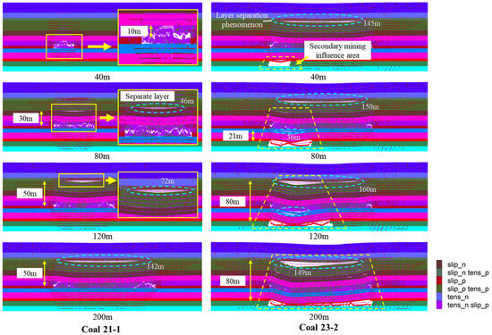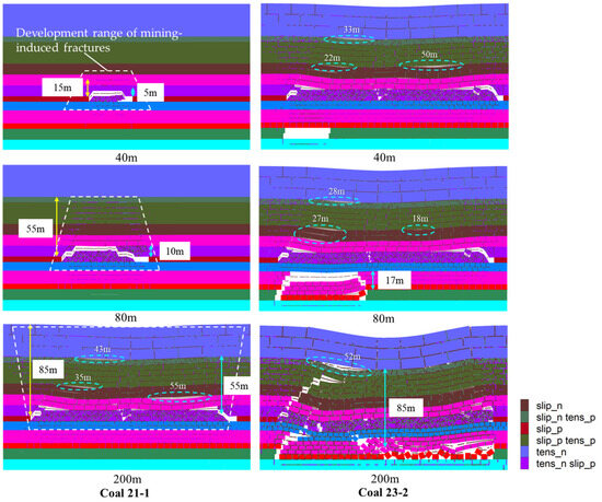 As the working face of the upper coal seam advances by 40 m, the roof of the 21-1 coal seam experiences its initial caving. The caving height in the immediate roof reaches 5 m, while the mining-induced effect extends to 15 m. Despite this, the overall structure of the overburden rock remains relatively stable. When the working face reaches 80 m, the fine sandstone layer in the immediate roof fully caves. At this point, the caving height increases to 10 m, and the fissure zone develops to a height of 55 m. The rock layers above the immediate roof maintain their integrity and a trapezoidal fissure development zone forms within the 55 m height range of the overburden rock at the working face. As excavation deepens, the number and extent of fissures increase significantly. Shear fissures mainly occur in high-shear-stress areas, such as at the contact surfaces between the coal seam and surrounding rock. In contrast, tensile fissures are more prevalent within the coal seam and at the top of the strata. When the working face advances to 200 m, the breaking length of the fine sandstone layer increases further before stabilizing. The mining impact on the overburden rock extends to the top of the model, forming an inverted trapezoidal fissure development zone. The transition between the trapezoidal and inverted trapezoidal areas primarily consists of newly formed sliding failures.