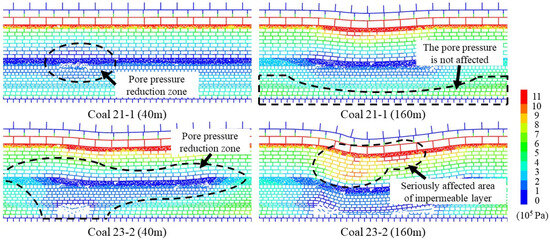 Figure 14 presents the distribution of pore pressure under repeated mining in weakly cemented strata. Mining causes a reduction in pore pressure around the goaf, disturbing the equilibrium in the strata. As a result, pore pressure migrates from high-pressure areas to low-pressure areas. When fissures open to a certain extent, the speed of pore pressure migration increases dramatically. When the working face of the 21-1 coal seam reaches 40 m, the unloading effect from mining reduces the pore water pressure around the goaf, creating a pressure difference in the strata. This causes the high pore pressure above the goaf to gradually migrate downward. As the working face advances to 160 m, the area of reduced pore pressure continues to expand, shifting from a trapezoidal shape to an “M” shape. The downward migration of high pore pressure becomes more pronounced. In the strata beneath the 23-2 coal seam, a region remains unaffected by the pore pressure changes. After the upper coal seam is mined, the 23-2 coal seam is then extracted. When the lower coal seam advances to 40 m, the reduction zones from both seams merge. As mining progresses to 160 m, the fracturing of the overburden rock and the formation of water-conducting fractures create a seepage channel on the left side of the model near the setup entry, which continues to expand. The overburden rock in this area is particularly affected by the mining operations.