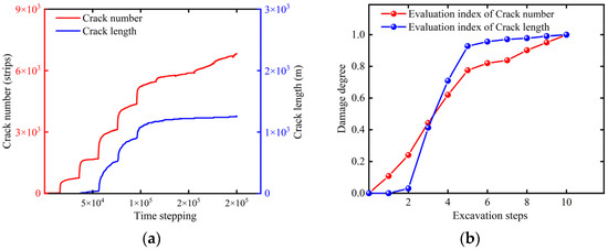 Adopting fissure number and fissure length as indicators of overburden rock damage, Figure 15b shows that prior to excavation, the overburden rock is unaffected by mining, resulting in zero damage. In the early stages of excavation, the mining influence on the overburden is minimal, and the damage level is low. The fissure number increases rapidly, while the increase in fissure length is significantly slower, which does not align with actual observations. Therefore, the fissure length instability indicator is considered a better representation of the overburden rock’s initial damage process. As the simulation progresses, the overburden damage level continues to rise. Once mining of the upper coal seam ends and mining of the lower coal seam begins (excavation step 5), the damage level of the overburden increases steadily but at a slower rate. The fissure length stabilizes, which does not correspond with the fissure development characteristics described in Section 4.3. As a result, the fissure number instability indicator is regarded as a more accurate representation of the overburden’s damage in the later stages of mining.