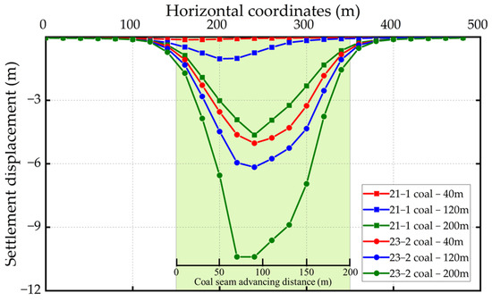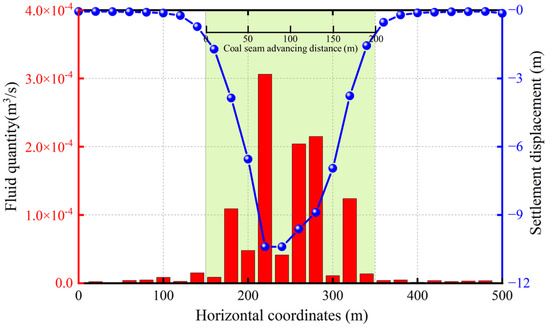 Monitoring points are placed every 20 m horizontally across the overburden rock to track subsidence and flow rates. The subsidence of the overburden rock during repeated mining is presented in Figure 16. The subsidence curve is asymmetric, with the peak closer to the left side of the model. As mining of the upper coal seam progresses to 40 m, 120 m, and 200 m, the maximum subsidence of the overburden rock reaches 0.09 m, 1.04 m, and 4.64 m, respectively. As mining of the lower coal seam continues, the subsidence increases further. By the end of the excavation, the total subsidence reaches 10.4 m. The most significant increase in subsidence occurs between 120 m and 200 m of mining. During this phase, large-scale fractures and caving occur in the immediate roof above the goaf, destabilizing the overburden rock and driving further subsidence. Additionally, the downward migration of the high-permeability pressure zone and the continued development of water-conducting fractures intensify the migration of the formation of water, exacerbating the fracture and instability in the weakly cemented strata. This leads to a substantial increase in roof caving and subsidence rates.