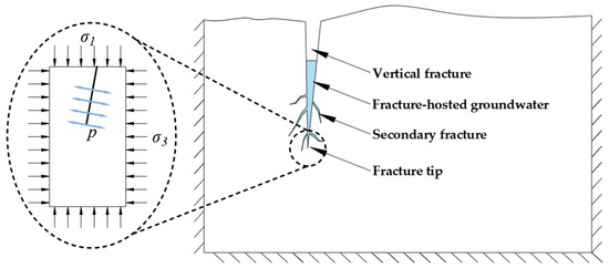 Under seepage conditions, the overburden rock fractures result from the combined effects of double-seam mining-induced stress and the pore pressure and hydration damage linked to the evolving seepage field. In weakly cemented strata, water exposure accelerates rock damage and deterioration. Repeated mining disturbances intensify both the stress and seepage fields, substantially increasing overburden permeability and facilitating fluid flow, thereby expediting the dynamic evolution of fissure and seepage fields [28]. When pore pressure acts on overburden fissures, an additional stress field develops at the fissure tips. Once this pressure surpasses a certain threshold, tensile stress at the fissure tips rises significantly, amplifying fissure propagation. The pore stress field generated by the pressure gradient also guides and controls fissure growth [29,30,31]. As shown in Figure 18, fissure water driven by the pressure gradient elevates internal rock pressure, promoting fissure development and continual extension along the fissure tips. This process creates numerous secondary fissures. Fissures typically extend along principal stress directions and weak cementation zones, eventually intersecting pre-existing fractures and forming more complex fissure networks. These networks further enhance rock mass permeability [32,33].