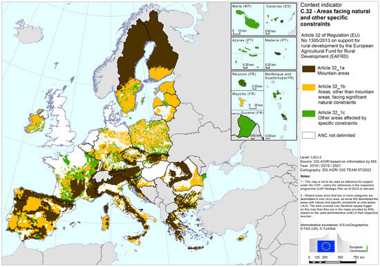 Distribution of ANCs in the EU. Source: European Commission, https://agridata.ec.europa.eu/extensions/IndicatorsEnvironmental/LessFavouredAreas.html (accessed on 17 January 2025).
