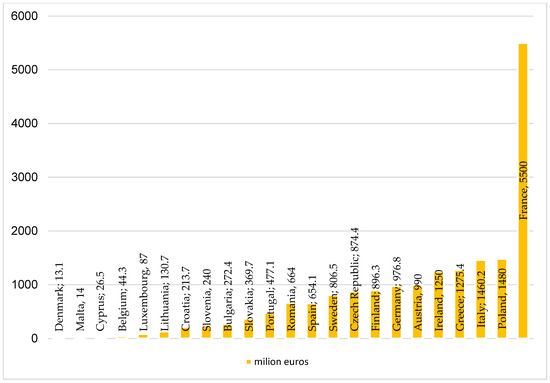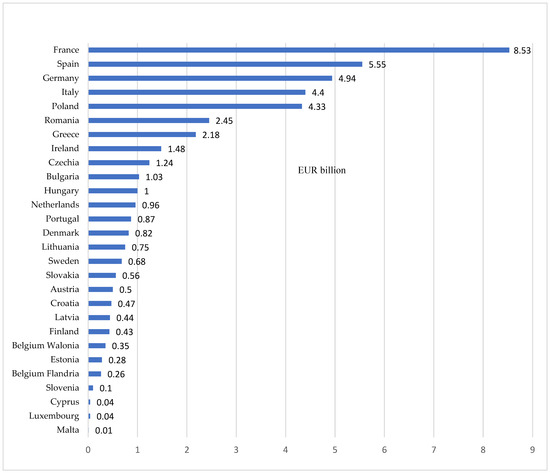 Eco-schemes are a new component of the direct payment system under the CAP 2023–2027, supporting the implementation of practices that are beneficial to the environment, climate and animal welfare [20,23]. These are annual, paid practices that are adjusted to the conditions and needs of the EU Member States to meet the environmental and climate objectives of current European policy for the protection of soil, water, climate, animal welfare and biodiversity in agricultural production [39,40]. In the EU Member States, the eco-schemes are designed to promote practices that contribute to improving agricultural income by increasing soil fertility, rational fertilization, and crop quality. These subsidies are able to account for a significant part of farmers’ income and influence their decision-making regarding production development [41]. The eco-schemes, together with other environmental measures under the current European policy, will play an important role in the EU’s efforts to achieve the goals of the European Green Deal. There is no doubt that the EU needs multifaceted eco-schemes with solid funding, clear goals and proven benefits to improve agricultural sustainability [42]. However, they must be continuously evaluated in farms in order to achieve correct implementation and deliver the best economic and environmental results [43]. Technological innovations, including satellite solutions applied to EU agriculture, will have much to offer in this area [44]. In CAP 2023–2027, the total budget under the eco-schemes is EUR 44.7 billion. France (EUR 8.53 billion), Spain (EUR 5.55 billion), Germany (EUR 4.94 billion), Italy (EUR 4.4 billion) and Poland (EUR 4.33 billion) have the largest eco-scheme budget. In contrast, this budget is smallest in Cyprus, Luxembourg and Malta, where agricultural production is carried out on a small area relative to other EU Member States (Figure 3). EU countries have different levels of support for eco-schemes, as a result of having different areas of UAA to which direct payments are due. Eco-schemes are part of direct payments that are dedicated specifically to the protection of the natural environment. At present, eco-schemes have taken hold to varying degrees in EU countries. Given their importance in the protection of the natural environment and the increasingly negative changes in agricultural markets, their use is likely to grow in EU agriculture.