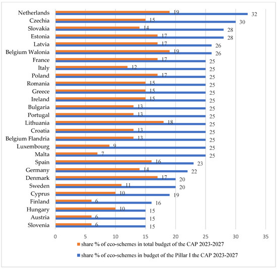 Share (%) of the eco-scheme payments in the Pillar I budget and total budget (Pillar I and Pillar II) under the CAP 2023-2027. Source: [18].