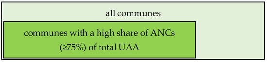 The distribution of beneficiary farms, the area of agricultural land, and the number and type of eco-schemes implemented were established by considering the natural conditions. For Polish holdings, this was achieved by conducting relevant analyses of the agriculture within communes where at least 75% of the total utilized agricultural areas (UAAs) were in ANCs, compared to the total agriculture (Figure 6 and Figure 7). In Poland, the current delimitation of ANCs was carried out by the Institute of Soil Science and Plant Cultivation—State Research Institute (IUNG PIB) and the Institute of Agricultural and Food Economics—National Research Institute (IERiGŻ PIB) (including by the authors of this study) in 2019, on behalf of the Ministry of Agriculture and Rural Development (MARD) and the European Commission [13]. The main advantage of using the newly designated ANCs in the EU is the use of the same delimitation criteria in the member states. The results of this analysis can therefore be used in other EU countries and beyond for comparative analysis.