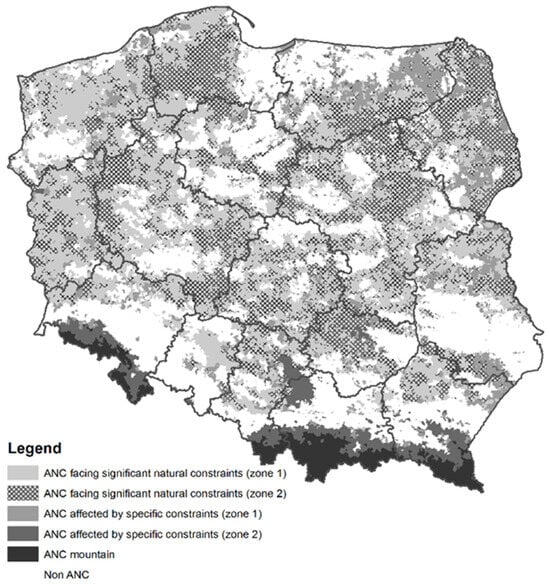 For the European Commission, one of its primary objectives under the European Green Deal strategy, its thematic strategies, and the CAP 2023–2027 is to strengthen existing efforts to protect the natural environment, including in ANCs, which are often an important source of environmental goods valued by society, such as diverse landscapes and high biodiversity [1,3,24,25,26,27,28,29]. Hence, in ANCs, it becomes particularly important to raise awareness and willingness among farmers to protect the natural environment, as well as support the economic viability of often marginally located rural areas of high social importance [30,31,32,33,34]. This is all the more so because farms in these areas generally have poorer economic performance and fewer opportunities for development compared to farms located outside ANCs [14,35,36]. The European Union supports these areas under European policy from 1975. Currently, this support is used to continue agricultural production in disadvantaged areas and to maintain and promote sustainable farming systems there. In other words, support for farming in ANCs is treated as compensation for producing not only market goods, but goods and services of the environment, which are important for society but not rewarded by the market. The benefits of this support involve both raising farmers’ awareness and inclination to protect the natural environment, and sustaining the vitality of often marginally located rural areas of great importance to society. On the other hand, given the high importance of ANCs in the EU, they play an important role in contributing to food self-sufficiency for the European community, including Poland, and preserving the EU’s ability to export agri-food products. The need to maintain agricultural production in ANCs also arises from the need to protect soils from degradation (erosion, acidification, soil organic matter losses), maintain many of their environmental functions, including retention, and maintain a diverse and valuable landscape. Thus, in the EU, including Poland, ANCs, in addition to market functions, also have a number of functions related to the protection of the natural environment, for which they are particularly predestined. This is evidenced by the large presence of areas with extensive agriculture in them, meeting the requirements of the European Union under the concept of High Nature Value farmlands (HNVf) and Natura 2000 areas. In addition, farmers in these areas are strongly inclined to take measures that specifically enhance environmental goods under the EU CAP [37].