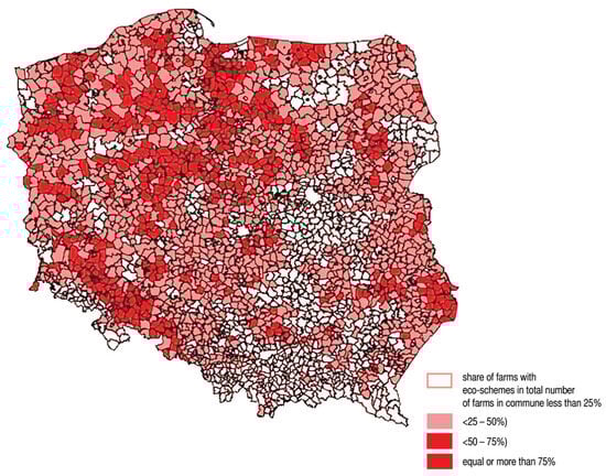 In 2023, 428.3 thousand farms applied for area-based eco-schemes, representing 1/3 of all farms in the country. These farms managed a total of 8897.9 thousand hectares of agricultural land. It should be emphasized, in these farms, the implementation of eco-schemes took place on all or part of their agricultural land, in addition, a different number of practices were implemented on this area. The most frequently chosen practice was the mixing of straw into soil, while the practice covering the largest area was reduced tillage systems [47]. Based on the data in Figure 9, which shows the share of farms covered by eco-schemes in the commune, it should be emphasized that in 2023, farms from regions with a higher level of agricultural development were more likely to participate in these measures.