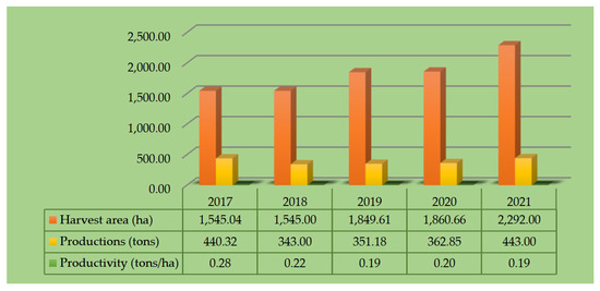 From Figure 1, it can be seen that South Sulawesi Province is the second largest producer of cloves after Maluku. Even though it is in second place, this is an important indicator of the fact that the clove commodity in South Sulawesi Province has considerable potential to support the plantation subsector development program. Based on data on the area of clove plantations in 2021, South Sulawesi Province has a land area of 67,337.00 hectares with a production of 21,431.00 tons [17]. Furthermore, Sidrap Regency, located in South Sulawesi Province, is listed as one of the locations that cultivates cloves. Figure 2 illustrates the harvest area, production, and productivity of cloves in Sidrap Regency for 2017–2021. As shown in Figure 2, the harvest area of clove farming continuously increased from 2018 until 2021. This is based on the data that were supplied. After reaching 1545 hectares in 2018, the harvest area in Sidrap Regency was constantly expanded to 1849.61 ha in 2019, 1860.66 ha in 2020, and 2202.00 ha in 2021. Meanwhile, from 2017 to 2021, there were different fluctuation levels in this commodity’s production. These situations, the rise in harvest area, and the fluctuation in productivity of this commodity are interesting facts that were explored further.
