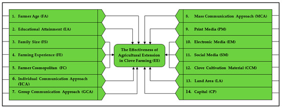 Research variables, including independent and dependent variables, are defined in behavioral studies to help conceptualize and organize research methods. These are the goals behind the creation of research variables. In the context of a specific research activity, a “variable” is any event, entity, or characteristic that changes in value and is intended to be researched, measured, reported, and assessed [117]. Kerlinger [118] defined variables as entities that can take on many values. We utilized dependent variables to measure attribute behavior in response to changes to one or more independent factors. To acquire a full grasp of the variables used and discussed in this study, we divided them into two categories: dependent variables and independent variables. The effect of the independent variables on the dependent variable’s behavior is interdependent. We selected to analyze the characteristics that reflect this study’s independent variables to understand better their link to the dependent variable, i.e., extension effectiveness. This approach was taken based on a previous study, which we refer to as the conceptual framework, as shown in Figure 3. We hypothesized that the 14 independent variables shown in Figure 3 are the most important predictors of the effectiveness of agricultural extension in clove farming.