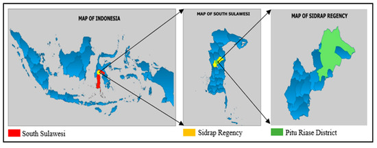 This study was conducted in Pitu Riase District, Sidrap Regency, South Sulawesi Province in Indonesia (Figure 4). The regency was purposefully selected as the research site because it was more accessible than other regencies. In 2020, the Bureau of Statistics (BPS) estimated that 23,350 farmers in Pitu Riase District were cultivating clove crops. So, the minimum sample size of the research was 137 clove farmers (rounded up to 140) based on the Slovin formula. The villages of Compong, Leppangeng, Dengengdengeng, Buntu Buangin, and Belawae were the five villages in Pitu Riase District from which we collected primary data. Because they were the most critical clove-producing communities in the district, we decided to focus on these five villages, with the primary selection criteria comprising farmers who had grown clove crops during the year 2023. One hundred and forty clove farmers were selected randomly and interviewed directly for this study. The number of samples collected during the research was adequate to accurately depict the population of clove growers in Sidrap Regency. A pre-designed questionnaire was used to collect primary data. To obtain primary data, a structured interview was carried out, and a pre-tested questionnaire was conducted with 15 individual clove farmers. The purpose of the pre-tested questionnaires was to assess the questionnaire’s clarity, validity, reliability, and suitability to the respondents, obtain an opportunity to revise the questionnaire, and assess the time needed for the actual interview. Before conducting the interview, each respondent who participated in the research provided was informed about the research objectives, methods, benefits, and publication purposes. This study was conducted according to the guidelines of the Declaration of Helsinki and was approved by the Institutional Review Board (Local Government) of Pitu Riase District of the Sidenreng Rappang Regency Government via Permit Letter No. 800/136/Kec.Pitu Riase.