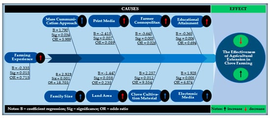 g(EE) = effectiveness of agricultural extension in clove farming (1 = effective, 0 = otherwise); β0 = constant; FA = farmer age (year); EA = educational attainment (years); FS = family size (people); FE = farming experience (year); FC = farmers’ cosmopolitanism (5-Point Likert Scale); ICA = individual communication approach (5-Point Likert Scale); GCA = group communication approach (5-Point Likert Scale); MCA = mass communication approach (5-Point Likert Scale); PM = print media (5-Point Likert Scale); EM = electronic media (5-Point Likert Scale); SM = social media (5-Point Likert Scale); CCM = clove cultivation material (5-Point Likert Scale); LA = land area (ha); CP = capital (IDR); and εi = error terms.