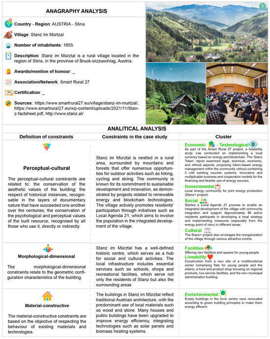 For each of the villages identified on the atlas and classified as best practice based on their compliance with the aforementioned criteria, a collection of the registry, systemic, and analytical analysis forms have been prepared (Figure 3). Each practice is identify by its atlas number (identified in the Figure 2) in the right corner. The registry section oreturns the geolocation, number of inhabitants, and image reference. The systemic section returns the technological description of the built environment of the village through its perceptual-cultural, morphological-dimensional, and material-constructive qualities [23].