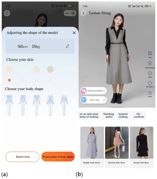 Taobao stands as China’s premier e-commerce platform and one of the largest globally [105]. Within its ecosystem, apparel is a cornerstone category, with a widely implemented AI-powered try-on technology that spans numerous brands and product types, serving a vast consumer base [106]. This technology integrates personalized adjustments, intelligent size recommendations, dynamic try-on, styling suggestions, and social sharing, all supported by advanced technology and a highly optimized user experience [83,107]. Given its extensive adoption and technological maturity, this research selects Taobao’s virtual try-on application as the research subject. The interface of Taobao’s AI-powered try-on technology is illustrated in Figure 2.