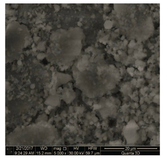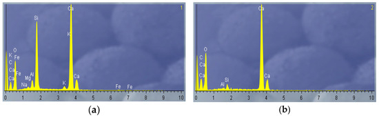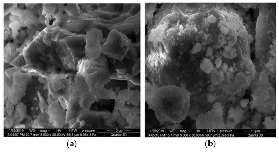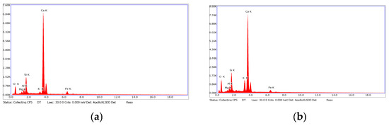 Aspiration dust has the following indicators: true specific gravity, 2.58 g/cm3; bulk density, 1.13 g/cm3; and specific surface area, 280 m2/kg. Clinker dust is characterized by the following indicators: true specific gravity, 3.12 g/cm3; bulk density, 1.24 g/cm3; and specific surface area, 220 m2/kg. The energy dispersive analysis of the powders under study confirms the presence of an aluminosilicate phase and the similarity with the specified characteristics of clinker (Figure 4a,b); micrographs were taken on a Quanta 3D 200i scanning electron microscope (Figure 5a,b).