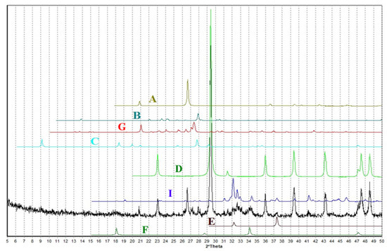 Diffractogram of the sample of the porcupine mergel 700 °C: A—quartz; D—calcite; B—albite; C—parogonite; F—portlandite; E—calcium oxide; I—larnite; G—microcline/orthoclase.
