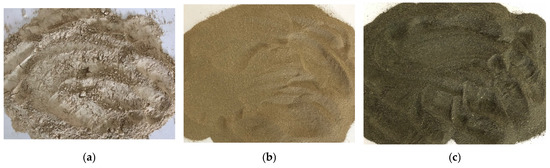 Photos of reactive mineral powders: (a) heat-activated porcupine mergel; (b) aspirating dust; (c) clinker dust.