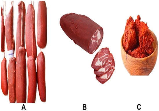 - Kaban, G. Sucuk and Pastırma: Microbiological Changes and Formation of Volatile Compounds. Meat Sci. 2013, 95, 912–918. [Google Scholar] [CrossRef]