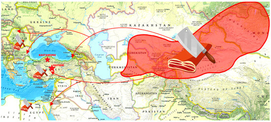 Food consumption patterns are seen as a cultural attribute and, as such, vary in accordance with the societal culture. As it is known, food culture is a result of the accumulation of years of knowledge transferred from generation to generation. Nomads, who mostly salted, pressed, and dried their meat, tried alternative methods for storing food at ambient temperature to safely consume it over an extended period of time [15]. According to historians and archeologists [16,17], Hun and Oghuz Turks, who led a nomadic and militant life in Central Asia, used to carry out their alimentation activities with salted meat and meat pieces of animals they hunted in order to advance on horseback without wasting time. They carried these pieces of meat in their saddles or saddlebags, which they placed on their mounts, and during their journeys that often lasted for weeks, the pieces of meat turned into pastirma by being stuck and pressed between horse and saddle [16,18,19,20]. Pastirma, a Turkish name, is derived from the verb “bastırma”, which means to apply pressure [21]. The primary ancestral territory of Hun and Oghuz Turks was in Central Asia, with the Khingan Mountains in the east, the Caspian Sea in the west, Siberia in the north, and the Himalayas in the south. Hun and Oghuz Turks have been migrating for thousands of years and have spread out from the mainland to various parts of the world [15]. Thus, pastirma culture has been reshaped as a consequence of migration to different geographical areas and its interaction with different cultures (Figure 2).