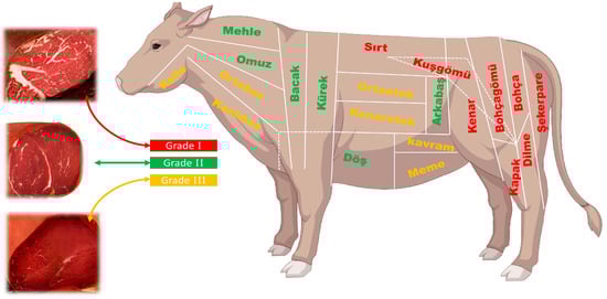 Pastirma is defined as dry-cured, pressed, washed, dried, coated with cemen paste, and re-dried whole muscles of beef or buffalo, classified as a ready-to-eat (RTE) product that does not require heat treatment. The different parts of the carcass produce different grades of pastirma, and up to 20 different types of pastirma can be made from mature cattle (Bos Taurus) or buffalo (Bubalus bubalis) carcass [9,31]. The chuck and neck (Mehle, omuz, ortabez, kanlıbez), shank (bacak, kürek), rib, short plate, short loin, sirloin and flank (sırt, kuşgömü, ortaetek, kenaretek, arkabaş, döş, kavram), and the round and part of sirloin (şekerpare, dilme, bohça, bohçagömü, kapak, kenar) are prepared to make different kinds of pastirma. Pastirma can be divided into three grades according to quality (Figure 3). Moreover, the figure also shows the parts of the animals from which specific pastirma types are made, and the anatomical names of the major muscle groups that make up these pastirma types are given in Table 1.
