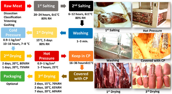 After that, excess parts are trimmed, like lymph nodes, fascia, tendons, and ligaments. Furthermore, muscles are given a rectangular shape. This process is called “açım”, which means trimming. Then, a rope is tied to one end of the meat blocks and prepared for salting. For this purpose, a process called “şaklama”, which means gashing, is performed. Sometimes, punctures are created in meat using the sharp point of a knife, while at other times, slices are formed. The meat is sliced into sections from its vast surface, often ranging from five to eight sections. These sections are cut at an angle of 45 degrees, ensuring that they do not exceed half of the overall thickness of the meat itself [50]. Each section is called “şak”. After şaklama, the first salting process is performed at 6 ± 1 °C for 20–24 h. Generally, rock salt with sodium nitrite (NaNO2) or rock salt with potassium nitrate (KNO3) are used. Rock salt with a size of 2.0–2.8 mm is used for dry salting [50]. The large particle size of rock salt leads to salt burns on the meat. Conversely, tiny salt particles can lead to oxidation, darkening, and overly salted products. Relatively cold environments that do not receive sunlight are preferred in the salting process. Dry-salted meat blocks are stacked to a height of 20–25 cm. After the first salting, the second salting process is performed at 6 ± 1 °C for 6–12 h. At this stage, parts of the meat that have yet to be treated are salted and turned over. Meat chunks stacked on top of each other is turned upside down. The recommended quantity of salt to be used in the first and second salting processes should be between 5 and 10% of the total meat weight. When the salt concentration exceeds 10%, it leads to yield loss in the final product. Then, salted meat is washed and rinsed to remove excess salt. This washing and rinsing process takes 1–3 min [31,50]. The washed meat is taken to the first drying process, called “sergileme”, which means exhibition. The meat parts are hung on special hangers to avoid contact with other objects. This drying process can be performed under natural conditions or in air-conditioned rooms. The conventional method of natural drying takes place in late September, October, and November for 3–5 days on windy and sunny days, when the weather is not too hot, or 12–15 days in cloudy and mildly cold weather. On the other hand, the commercial drying method is carried out in climate rooms with 80–85% relative humidity at 15 ± 1 °C and 15–30 m/min airflow for 5 days. After that, the first press, called the “soğuk denkleme”, which means cold pressure, is performed. At this stage, 0.9–1 kg/cm2 pressure is applied to the dried meats at 7–8 °C for 10–17 h [50]. Meat loses some water at this time and appears flattened. Also, the sections called “şak” are closed. The next step is the second drying. The surfaces of the pressed meats are moist. Therefore, a drying process is applied to the meats from 3 to 5 days, depending on the temperature and relative humidity. At the end of this process, the moisture in the meat can be below 34%. In addition, the fat on the surface of the meat melts and gives it a white appearance. This is referred to as “ağarma”, which means bleaching, among manufacturers. After that, the second press, called “sıcak denkleme”, which means hot pressure, is performed. Hot pressure is applied to 0.9–1 kg/cm2 at 20–25 °C for 1–7 h [50]. Finally, the meat coming out of the hot pressure process is covered with cemen paste and hung from 4 to 7 days to dry. Actually, the meat is kept covered in cemen paste for 16–36 h, and then, it is covered with cemen paste with a maximum thickness of 4 mm and left to dry for 7–11 days [31,50,51,52,53]. It is crucial to remember that the cemen paste dough does not contain salt, and the cemen paste absorbs salt from the meat during the cemen paste process. A flow-sheet of the manufacturing process of pastirma is shown in Figure 4.