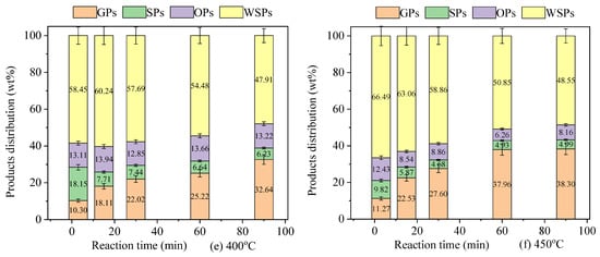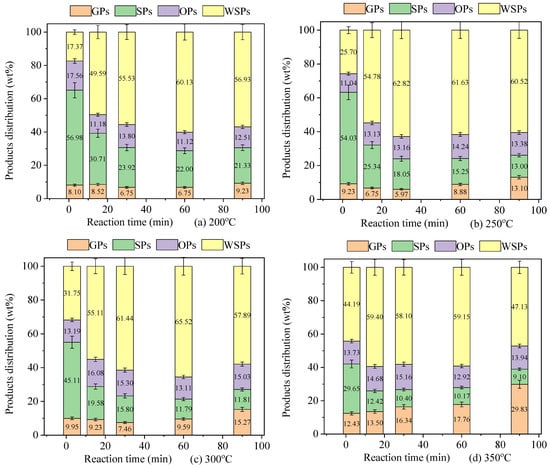 Across all temperatures, product distribution varied significantly within the first 30 min, indicating a rapid reaction phase. After this period, changes in product distribution became less pronounced, and the influence of reaction time decreased. Below 350 °C, an increase in temperature predominantly led to a rise in OPs, with minimal impact on gas yield. Conversely, above 350 °C, higher temperatures resulted in decreased OPs and increased GPs. Therefore, the temperature range of 350–400 °C was critical for product distribution, aligning with the transition of water into its supercritical state.
