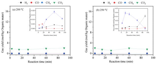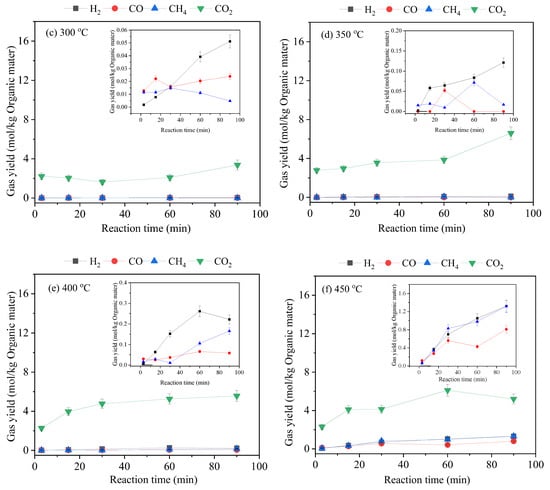 Gas yields during HC of DSS. (a) 200 °C; (b) 250 °C; (c) 300 °C; (d) 350 °C; (e) 400 °C; (f) 450 °C.