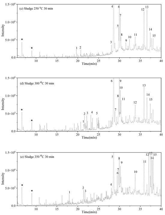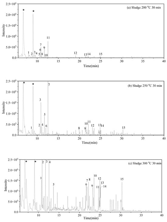 Figure 3 shows the GC-MS total ion chromatogram (TIC) spectra of substances in the aqueous phase at different reaction temperatures. A reaction time of 30 min was selected based on the observation that the gas, solid, and liquid phases of the products exhibited minimal changes beyond this duration, as shown in Figure 1. The 15 largest peaks, are listed in Table 2 (ranked by peak area) and Tables S1–S6 (ranked by retain time). The peak numbers of water-soluble products (WSPs) are denoted as S-W-T(X), where “S” refers to the sludge, “W” indicates the water-phase products, “T” represents the reaction temperature, and “X” corresponds to the serial number of the peaks. The data under each peak number reflect the peak area. It is important to note that a portion of the WSPs adhered to the walls of the centrifugal glass tube following freeze-drying and could not be fully dissolved in acetone. Consequently, this portion of the WSPs was not detected by GC-MS. For example, much of the nitrogen in the sludge is typically converted into ammonium (NH4+) [], which is not detectable by GC-MS.