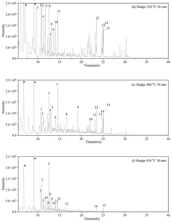 GC-MS TIC spectra of WSPs during HC of DSS. (a) 200 °C; (b) 250 °C; (c) 300 °C; (d) 350 °C; (e) 400 °C; (f) 450 °C. The peaks marked with an asterisk (*) represent diacetone alcohol and phenol impurities present in the acetone.