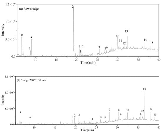 As shown in Figure 4a and Table 3, the largest peak area in raw sludge was observed for peak S-O-(2), which accounted for 42.46% of the total area of the first 15 peaks. The steroid compound peak S-O-(10) represented a significant proportion of the fatty substances in the sludge, with its peak area constituting 12.55% of the total area of the first 15 peaks. This could be attributed to the maturation of the sludge during storage. Other major components in the OPs included alcohols, long-chain esters, alkenes, and amines.