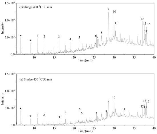 GC-MS TIC spectra of lipids of raw sludge and OPs during HC of DSS. (a) Raw sludge; (b) 200 °C; (c) 250 °C; (d) 300 °C; (e) 350 °C; (f) 400 °C; (g) 450 °C. The peaks marked with an asterisk (*) represent diacetone alcohol and phenol impurities present in the acetone.