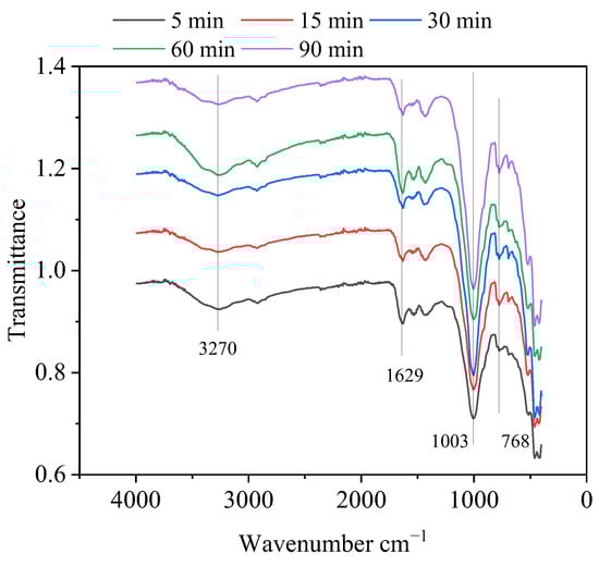 Figure 5 presents the FTIR spectra of eluted solid residues, which include both the generated products (GPs) and inorganic components, at 200 °C. The main peak near 1000 cm−1, along with additional peaks around 768 cm−1, exhibit an increasing intensity with rising temperature. This trend suggests the continuous formation of phenolic compounds during the process. The main precursor of char is humus [], which contains a large number of aromatic rings. Some of these rings are likely not ring-opened during the hydrothermal process, leading to the accumulation of phenolics in the char. Furthermore, the increase in the broad peaks around 3270 cm−1, which are likely associated with O-H, C-H, and N-H stretching vibrations, coupled with the enhanced intensity of the C=O stretching vibration at 1629 cm−1, indicates the presence of amide groups in the solid residues. This observation suggests that, at 200 °C, the sludge retains certain protein-like substances, as previously discussed in our earlier studies []. Moreover, it implies that the hydrolysis reaction has not been fully completed at this temperature. The FTIR spectra of eluted solid residues at various temperatures have been further elaborated in our previous works []. In summary, as the reaction time and temperature increase, the solid products predominantly undergo conversion into char, which is enriched with phenolic compounds.