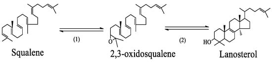 Steroid compounds are typically synthesized within organisms. Figure 6 illustrates the biosynthetic pathway for the conversion of squalene to lanosterol in biological systems []. However, steroid compounds can also be synthesized outside of living organisms [] or under high-temperature conditions []. Between 250 °C and 350 °C, the formation of steroid compounds continues to increase, indicating that long-chain olefins are capable of forming steroid compounds under subcritical water conditions. The steroid compounds generated during this process exhibited a relatively high degree of stability and resistance to further decomposition.