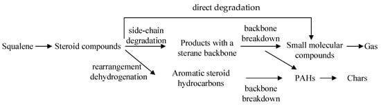 The possible reaction pathways for the formation and conversion of steroid compounds are proposed in Figure 7. Steroid compounds primarily occur in the oil-phase products, with a significant decrease in their concentration observed between 400 °C and 450 °C, indicating that steroids undergo degradation at these temperatures. In microbial degradation of steroid compounds, side-chain cleavage typically occurs first, followed by the cleavage of core rings into smaller molecular compounds, such as acids [,]. However, few intermediate products resulting from side-chain cleavage, ring opening, or small molecular acids were detected in the oil-phase products. This observation, coupled with the increased yields of gas-phase products (as shown in Figure 1) at higher temperatures, suggests that these intermediate products are highly unstable and decompose rapidly, generating gaseous compounds. Another possible decomposition pathway for steroids is the direct degradation of ketones at elevated temperatures [,]. Furthermore, steroid compounds can undergo rearrangement and dehydrogenation to form aromatic steroid hydrocarbons, which can subsequently lead to the formation of polycyclic aromatic hydrocarbons (PAHs) through the breakdown of the backbone [,]. These PAHs can further polymerize into char or tar []. However, the limited detection of PAHs suggests that they may rapidly polymerize into char, implying that steroid compounds may serve as precursors to char formation.