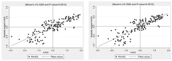 The definitions of , , and remain consistent with the previous text; , , and are coefficients to be estimated; and denote control variables. Additionally, W stands for the spatial weight. In the SDM model, the coefficient of the core explanatory variable indicates the impact of the CBEC-PZ on local air quality; the coefficient of the variable indicates the impact of the CBEC-PZ on the air quality of the neighboring cities, reflecting the spatial spillover effect. In this paper, the spatial inverse distance weight matrix is constructed to carry out the spatial correlation test.