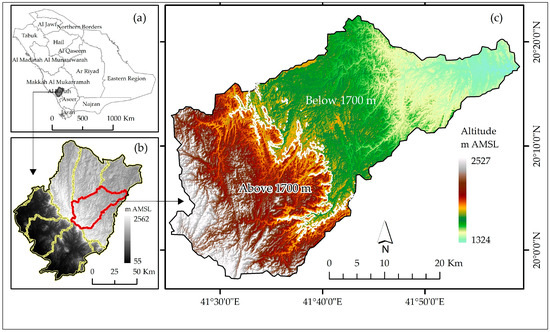 (a) Location of Al-Baha in Saudi Arabia. (b) Watersheds within Al-Baha Province; watershed boundary in red indicates the area of interest. (c) Altitude range in the watershed of interest; white line indicates the 1700 m contour.