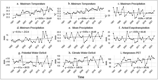 Figure 2 shows the trends of the annual averages of key climatic variables from 1991–2023 for the watershed, which were sourced from TerraClimate (https://www.climatologylab.org/terraclimate.html, accessed on 9 December 2024) and analyzed via interquartile ranges to remove outliers. These trends reveal indications of ecological stress. Rising maximum and minimum temperatures signify increasing thermal stress, whereas increasing minimum and mean rainfall and decreasing maximum rainfall suggest potential reductions in rainfall variability. The negative trends in actual evapotranspiration and potential water deficit further indicate hydrological imbalances. Additionally, increasing Hargreaves PET highlights the increased atmospheric demand for water, exacerbating the stress on the watershed. These variables collectively serve as sensitive indicators of climate-induced ecological stress.