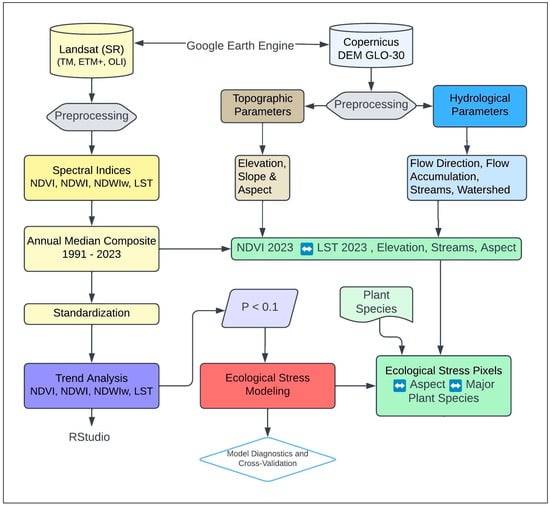 The objectives of this watershed study are threefold: first, to estimate the extent of vegetation cover and its relationship with elevation, temperature, proximity to seasonal streams and slope aspects; second, to calculate trends in ecological variables, including the NDVI, NDWI, NDWIw, and LST, from 1991–2023 via the use of Kendall Tau b coefficients with significance thresholds (p < 0.05); and third, to predict ecological stress by integrating these trends into a GAM model.