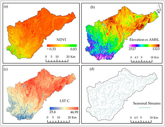 Spatial patterns of the ecological variables in the study area: subfigures (a) median NDVI (2023) illustrating vegetation distribution, (b) elevation (AMSL) showing topographic variation, (c) median LST (2023) in Celsius, and (d) seasonal stream.