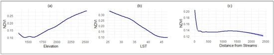 GAM-derived relationships between the NDVI and predictors. Subfigure (a): significant nonlinear relationship with elevation, accounting for 40.96% of the NDVI variability. (b) LST: strongest predictor, explaining 50.44% of the variance in the NDVI. (c) Distance from streams: localized influence near streams, explaining 4.28% of the variability.