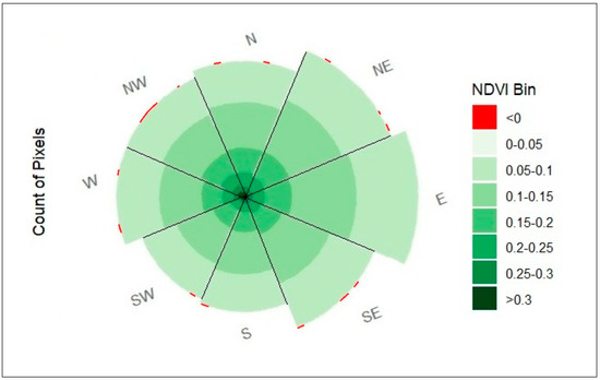 Distribution of the NDVI across different aspects within the watershed. Directional labels: N (North), NE (Northeast), E (East), SE (Southeast), S (South), SW (Southwest), W (West), NW (Northwest).