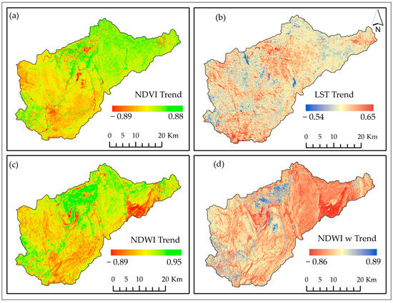 Spectral index trends with p-values < 1 (which shows all trends) based on Kendall’s tau-b correlation (1991–2023) for the Al-Baha Highlands. The subfigures (a–d) represent trends for the NDVI, LST, NDWI, and NDWIw, respectively.