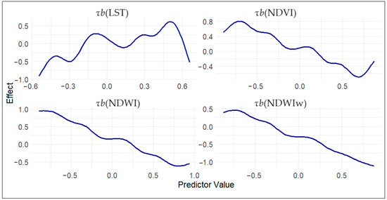 Here, thin plate splines (bs = “tp”) with 10 knots (k = 10) are applied to the Kendall tau-b trends of the NDVI, LST, NDWI, and NDWIw. This allows the model to capture the nonlinear relationships between these predictors and the stress score, providing flexibility without overfitting.
