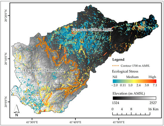 The Shapiro–Wilk test revealed that the ecological stress for the highland and lower-elevation ecosystems deviated significantly from normality (p-values < 0.05). Consequently, the Wilcoxon rank-sum test was performed, indicating a highly significant difference in the ecological stress values between the groups (W = 3.2923 × 1012, p-value < 2.2 × 10−16). Elevation strongly influences ecological stress.