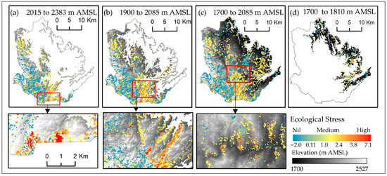 Individual stress rasters were subsequently combined into a composite ecological stress raster by summing the weighted stress values, ignoring the NA values to ensure accurate aggregation, Equation (7).