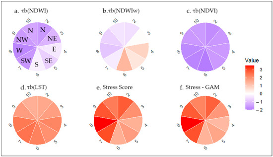 Aspect-wise trends in (a) NDWI, (b) NDWIw, (c) NDVI, (d) LST, (e) stress score, and (f) GAM-predicted stress across elevations ranging from 1323 m to 1700 m AMSL. Red shading indicates positive trends, whereas blue shading indicates negative trends from 1991–2023.