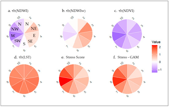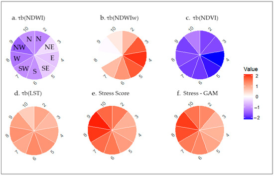 The stress score was calculated by applying p-value masking (p < 0.1) to exclude statistically insignificant trends. The trend values (τ) were weighted on the basis of stress direction, with negative trends (e.g., NDVI, NDWI, and NDWIw) calculated as −τ⋅W and positive trends (e.g., LST) calculated as τ⋅W, where W represents variable-specific weights, Equation (6).