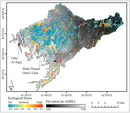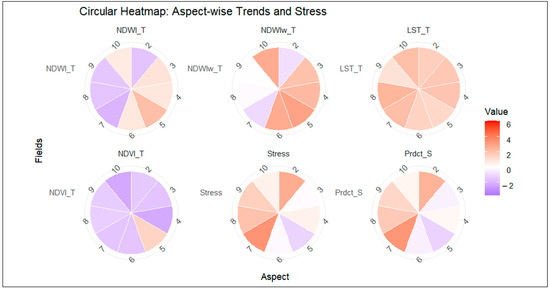 Figure 15 illustrates the trends in the ecological indices and stress levels across the different slope aspects. The flat aspect is associated with lakes having the lowest thermal stress due to changes in land cover to artificial lakes, with a significant negative LST trend (−8.59), and the highest water availability, indicated by a strong positive NDWIw trend (2.42). However, despite favorable water conditions, vegetation health is highly stressed, as indicated by a declining NDVI trend (−2.73), suggesting reduced productivity, potentially due to changes in land cover to artificial lakes.